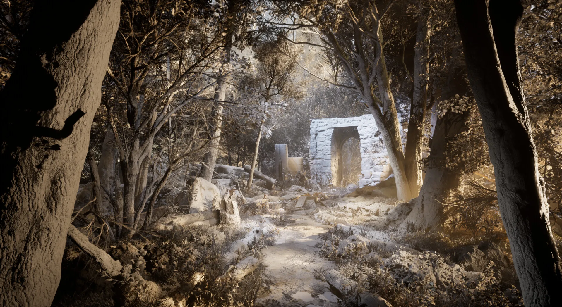 Composición e iluminación para la escena creando ruinas en el bosque