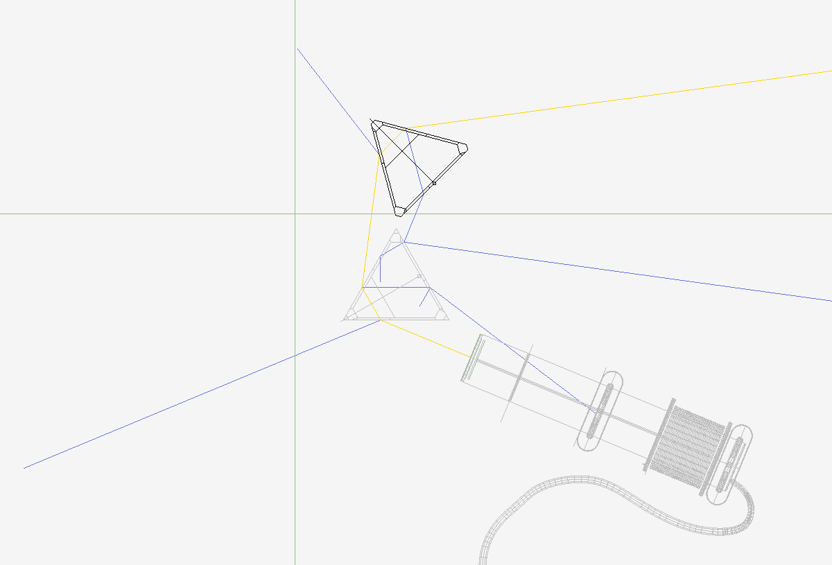 Un emisor plano encerrado en un cañón con dos paneles verticales para dirigir la luz. Los prismas tienen un ior de 1,85 y un abbe de 23,80. Materiales plásticos, metálicos, madera, etc.