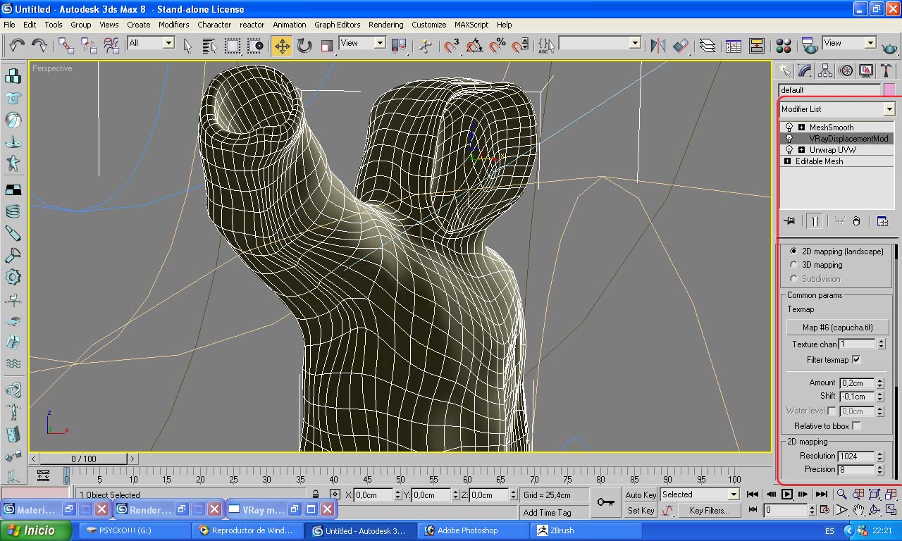 A la malla en 3dsmax le aplico Unwrap(lo edito, pero solo haciendo click, o sea, que no me pongo abrir la malla como debería, y le meto el Vray displacement y un Mesh Smooth, el mapa esta volteado verticalmente y, no sé, es que no me expliko porque no me lo hace.