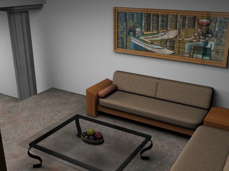 Fíjate en los cojines del sofá, comparalos con fotografías de referencia; ¿no te parecen demasiado homogéneos en cuanto a forma y textura? A mi recuerdan más algunas galletas que ha un cojín. Los filos de las columnas ¿están biselados? Debes revisar el texturizado de todos, sin falta, los elementos de la escena, algunos están demasiado saturados, otros con escalas irreales, o muy grandes o muy pequeñas y poco definidas. ¿tienes mapas de reflexión, Bump, especulares y suciedad? Saltan a la vista los mapas del canal difuso, pero los otros son menos evidentes, las texturas están demasiado parejas.