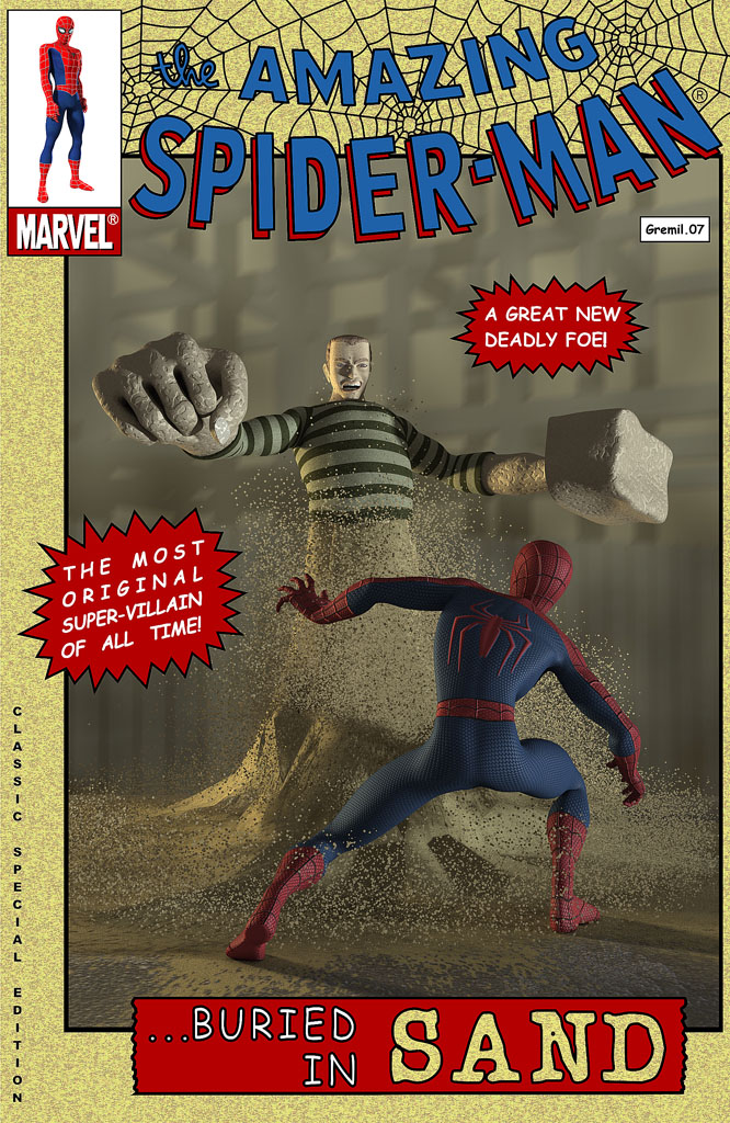 Sigo con cosas relacionadas con Spider-man, en este caso se trata del hombre de arena. En principio quería modelar a escorpión, pero me propusieron hacer al arenoso ya que esta de actualidad y a eso me he dedicado, he realizado dos tipos de acabado, un render con Vray y el otro con Final Toon, el gráfico que conforma la portada está hecho en Corel Draw, el montaje final en Adobe Photoshop, donde además he subido la intensidad de color del hombre de arena para adecuarlo más al resto de la escena.