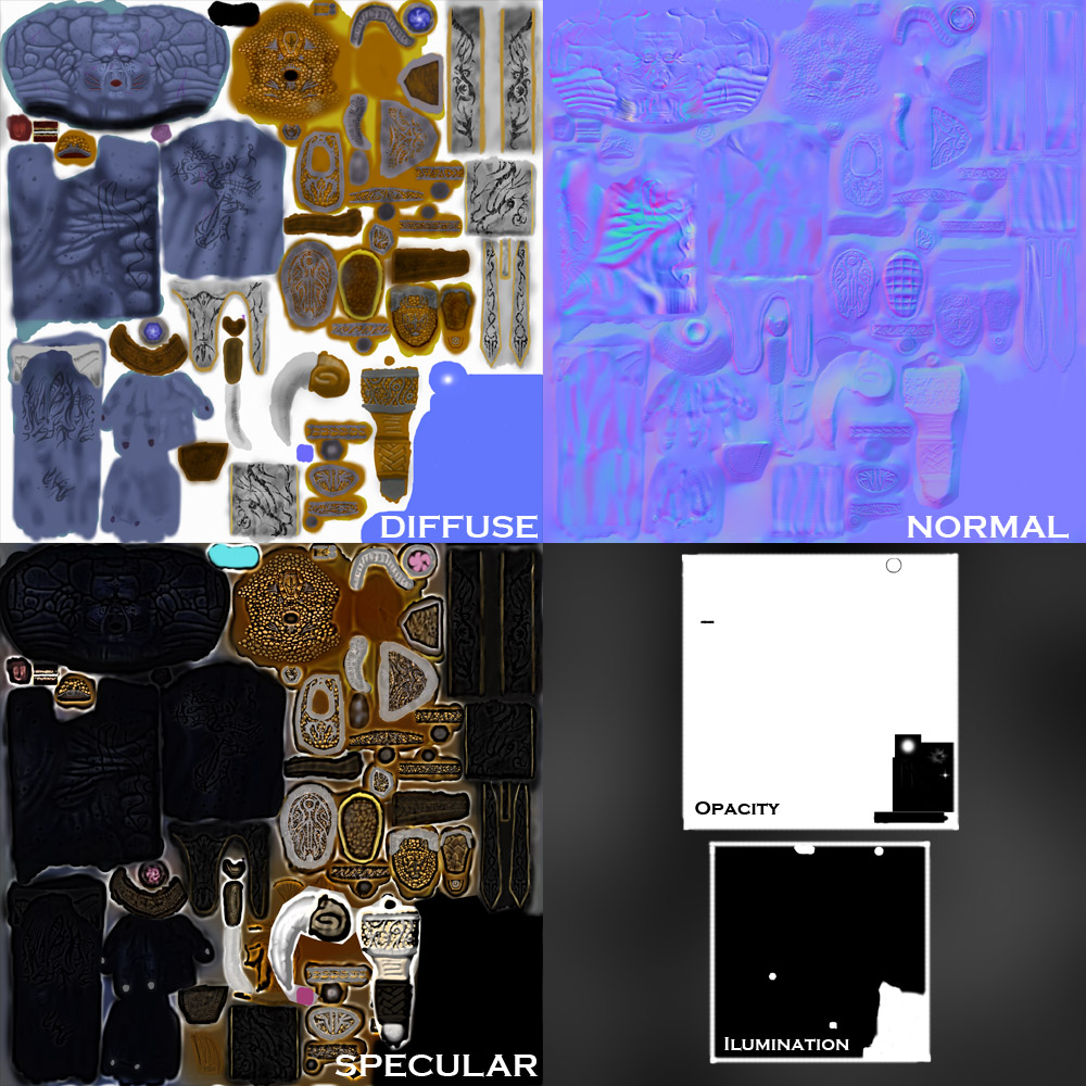 En sí, la idea de hacer el mapa especular, fue más que nada para que la armadura brillara más que la piel, porque sin el parecía que el tío era metalizado. Aun así, está claro que, aunque la armadura ahora brilla más que la piel y las telas, el Specular no funciona todo lo bien que debería, en eso sí te doy la razón de nuevo, Fiz.