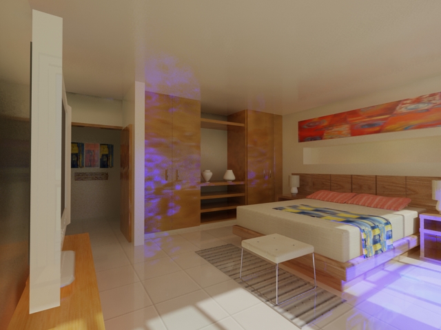 Estimados compañeros solicito su colaboración con este interior. Como ven se presenta una vez renderizo unos puntos de color azul que no entiendo de dónde provienen. Hasta unos pasos anteriores no se veían, no sé qué hacer, quién me colabora por favor y de paso más sugerencias. Gracias.