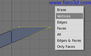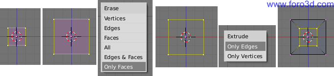 A continuación, muy importante, borrar la cara que forman las cuatro líneas que tenemos, pero sin borrar los vértices y líneas en sí. Para hacerlo nos aseguramos que están los cuatro vértices seleccionados de amarillo, y pulsamos x. En el menú que aparece selecciona la opción only Faces, abajo del todo.