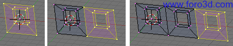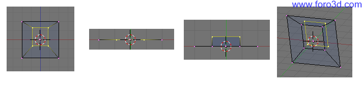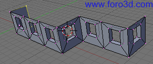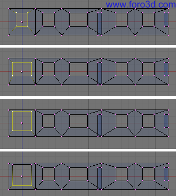 Selecciona todos los vértices de nuestro objeto (pulsando a una o dos veces) y duplícalo, pulsando mayúsculas+d, x, 4, enter. Y otra vez mayúsculas+d, x, 4, enter. También lo podíamos haber movido usando el ratón y teniendo pulsada la tecla control para que encaje perfectamente.