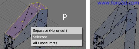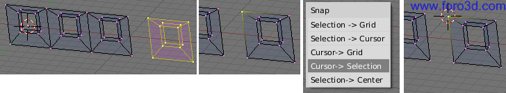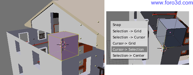 Vamos a llevar el cursor al vértice superior izquierdo de esta nueva pieza. Para hacerlo selecciona este vértice haciendo clic cerca de el con el botón derecho del ratón. A continuación pulsa mayúsculas+s y en el menú que aparece, elige cursor > selection.