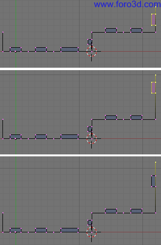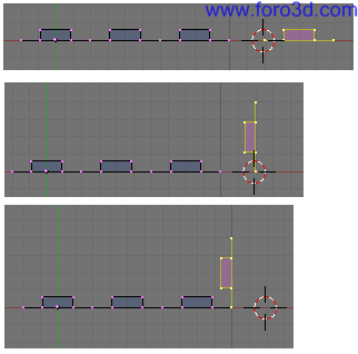 A continuación vamos a extruir en dirección al eje Y. Pulsamos eh, only Edges, y. Mueve los nuevos vértices tres posiciones de cuadrícula hacia arriba (g y, 3, enter).