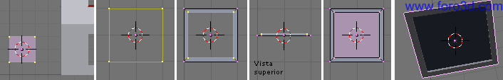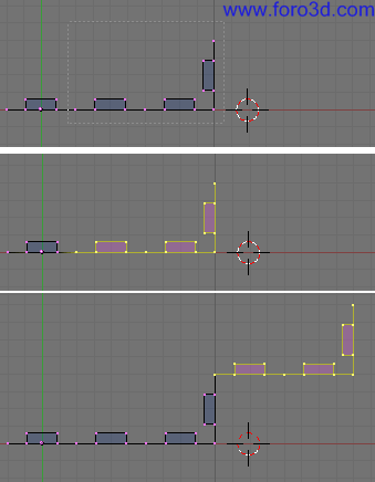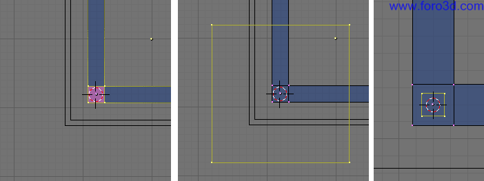 Ahora, en vista superior (7), selecciona todos los vértices del trozo de pared que queremos girar. Se puede hacer pulsando la tecla b y trazando un rectángulo que pille todos esos vértices, pero ninguno de otra de las paredes.