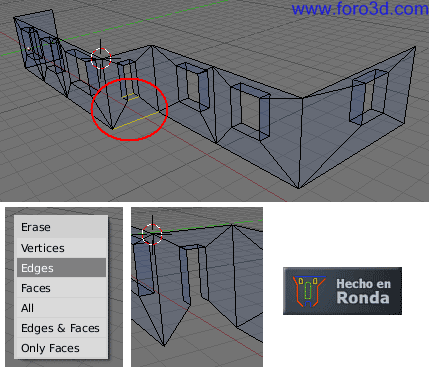 En nuestra malla, selecciona las tres líneas inferiores del hueco de la ventana que vamos a transformar en una puerta y las eliminas pulsando x, Edges.