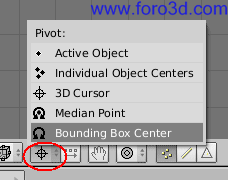 Nos tenemos que asegurar en este punto que cuando cambiemos de tamaño los objetos se hará en relación al centro de la selección. Lo podemos hacer pulsando la tecla coma, o bien pulsando el botón correspondiente de la barra de herramientas y seleccionando la opción bounding box center.