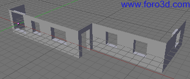 Por último, nos queda hacer que la pared frontal también llegue hasta el suelo, que antes cuando modelamos la primera ventana se quedó dos posiciones más arriba. Para hacerlo selecciona la línea inferior y muévala (g, z) dos posiciones hacia abajo.