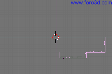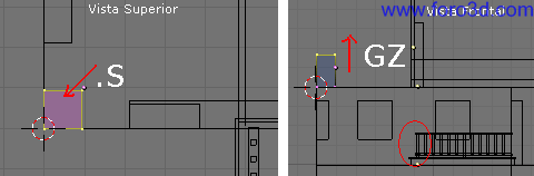 En vista superior lo situaremos de forma que la parte superior derecha esté tocando al eje rojo x y la parte inferior izquierda esté dos cuadros más a la derecha del eje verde y. Estos dos cuadros serán la mitad del lugar que va a ocupar la zona de las escaleras que vamos a modelar a continuación. Pulsa g y mueve el ratón teniendo la tecla control pulsada para llevar el objeto exactamente a la posición correcta.