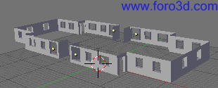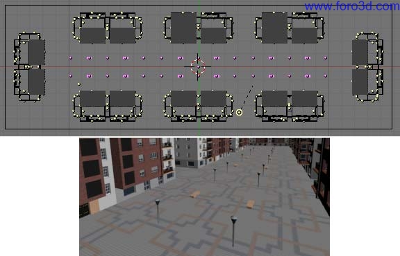 En nuestro caso vamos a hacer una escena completamente libre. Se trata de una calle con tres edificios a cada lado y uno en cada extremo. Total ocho bloques de pisos.