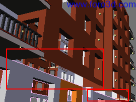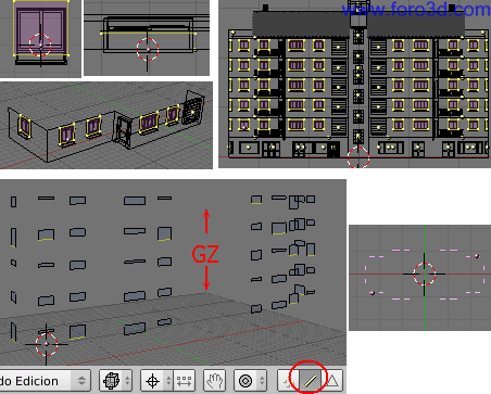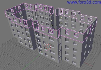 A continuación vamos a modelar las paredes de la zona central del bloque de pisos. Aquí tenemos una serie de ventanas que se encontrarían en los descansillos de las escaleras, por esto están situadas a diferente altura que las demás ventanas.