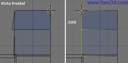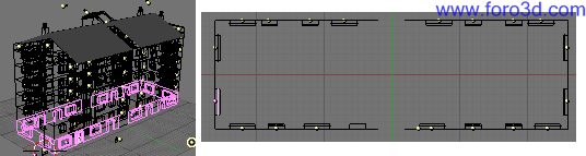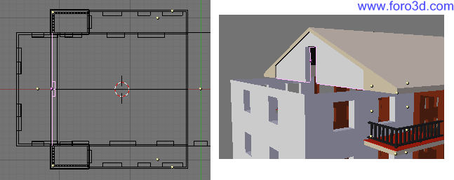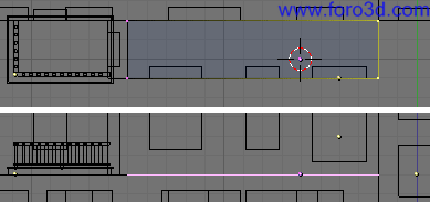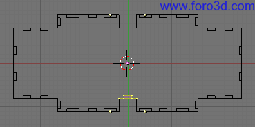 Para terminar el ensamblaje de las paredes lo último que nos queda es un trozo de pared sin ventanas en la parte izquierda del objeto. En vista superior seleccionamos pulsando b y trazando un recuadro los dos vértices de más a la izquierda. Solo vemos uno porque están superpuestos, pero hay uno arriba y otro abajo.