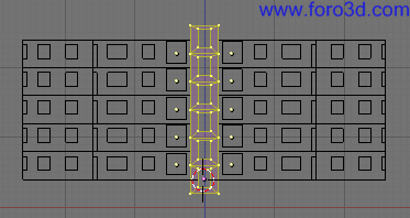 Otra vez en vista frontal, y siguiendo dentro de modo edición, duplica nuestra pared cinco veces hacia arriba hasta que salga por lo alto de la última planta. Elimina los vértices duplicados (w, remove doubles), y tendría que salir algo parecido a esto, un solo objeto con todas las ventanas.