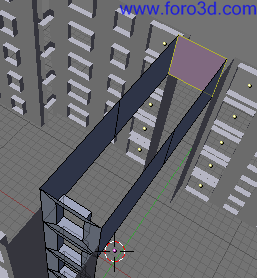 Para construir toda la pared del fondo, es suficiente con extruir hacia abajo la línea inferior de la cara que acabamos de crear, formándose un nuevo plano que llegue hasta el suelo. En esta fachada posterior no hay ventanas porque es el sitio por dónde iría el ascensor.
