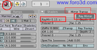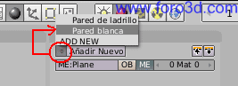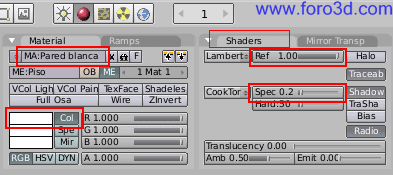 En la paleta de materiales, establece el color como blanco. Pulsa sobre el cuadro coloreado de gris que hay más arriba donde hay tres y en la paleta de colores que, aparece selecciona el blanco. En la paleta de la derecha, en la pestaña llamada Shaders, puedes establecer la reflexión (ref al valor máximo posible llevando el control hacia la derecha. También vamos a bajar el valor de especularidad (especularidad a 0,2 para que la pared sea más mate. Asígnale a este material el nombre de pared blanca, escribiéndolo en el recuadro de la parte superior de la paleta de materiales.