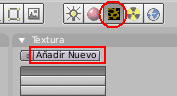 Selecciona el plano del suelo y vamos a editar su material para añadirle está nueva textura. Un material puede tener hasta diez texturas que afecten de distinta forma a distintas propiedades como colores, brillo, relieve, etc. Ahora tenemos solamente una textura que afecta al color y al relieve. Para meter otra nueva, en los botones de material, en la última paleta de botones, en la pestaña de textura pulsa el segundo botón, el de debajo del que está ahora hundido. A continuación pulsa el botón añadir nuevo que está a su derecha. Veras que se le coloca una marca delante. Esto quiere decir que se le a asignado una segunda textura.