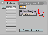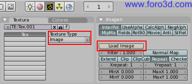Ahora vamos a asignarle la imagen como siempre. Pulsa el botón de texture buttons (f6) de la barra de herramientas, en tipo de textura selecciona imagen, y en la paleta imagen pulsa el botón naranja load image y abre el archivo con la imagen que necesitamos.