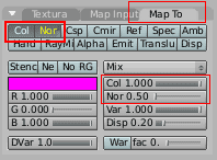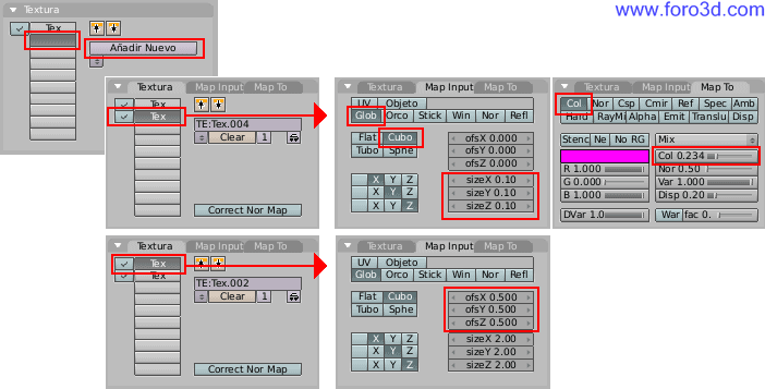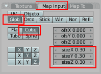 Finalmente ve a la primera pestaña, texturas, y selecciona la primera textura. Abre la pestaña Map Input. Ahora los valores que ves son los de la primera textura. Modifica los valores Ofsx, Ofsy y Ofsz a 0.5 para que las dos texturas encajen correctamente.