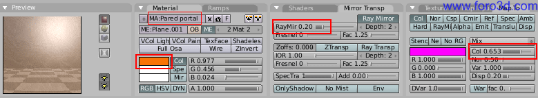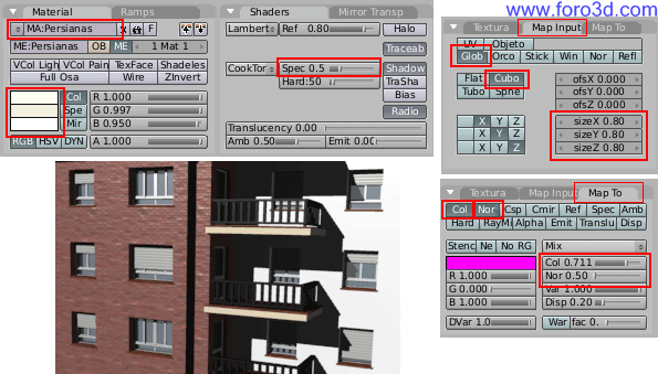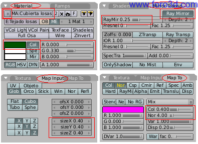 El material será blanco un poco amarillento, muy poco. Más brillante que la pared (Spec=0.5). La textura estará mapeada en forma de cubo para que se vea bien en todas las ventanas, según las coordenadas globales (Glob) y afectara un poco al color y también al relieve (NOR). El tamaño de la textura (cuadros size) habrá que ajustarlo para que las listas no sean demasiado gruesas.