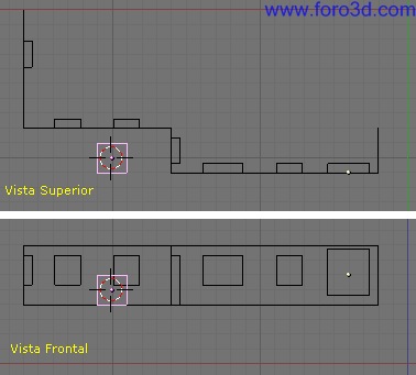 A partir de ahora vamos a mover vértices de las paredes para que tengan las dimensiones definitivas. Si estuviéramos trabajando con un plano o con medidas reales tendríamos que hacerlo con precisión para que todo sea proporcional a lo deseado. Blender no es un programa de CAD y no podemos indicarle medidas exactas en metros ni nada, nos tendríamos que limitar a contar cuadros de forma aproximada.