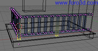 Ahora viene el paso más importante. Pulsa w y en el menú selecciona bevel. En el cuadro que aparece deja recursión=1. Ahora mueve el ratón y observa cómo se van separando los cristales y los palos verticales y horizontales que forman la cristalera. Déjalos con una anchura adecuada y haz clic con el ratón. Se habrán creado todos los vértices necesarios. A continuación vuelve a ajustar un poco el tamaño del objeto para que llegue a la pared si se había separado, observe que no quede un hueco en la parte inferior ya que el poyo está inclinado y en vista frontal puede confundir.