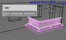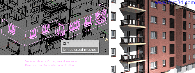 Hay que seleccionar las cuatro ventanas pequeñas, la ventana grande, la puerta del balcón y la rejilla. Finalmente hay que seleccionar la pared. Se tendrán que quedar todas las ventanas de color rosa oscuro y la pared de color rosa claro, es muy importante que sea así. Cuando esté bien seleccionado y además no haya ningún otro objeto seleccionado, pulsa las teclas Control +f, confirma la pregunta join selected meshes ok? Y verás cómo por arte de magia todos los pisos tienen las ventanas.