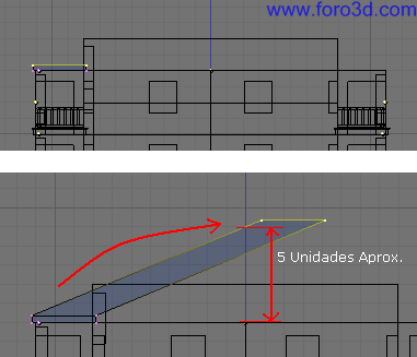 En vista superior extruye estas líneas hacia atrás dos veces. En este caso al pulsar la tecla e para hacer la extrusión no sale ningún menú, directamente se hace extrusión de líneas. Puedes pulsar y para indicar la dirección y arrastrar dejando pulsado control. La primera extrusión desplazamos hasta aproximadamente la mitad del edificio, y la segunda vez hasta el sitio justo que encaje con la estructura que ya tenemos. Hacerlo dos veces es para después poder obtener el ángulo de las dos vertientes del tejado.