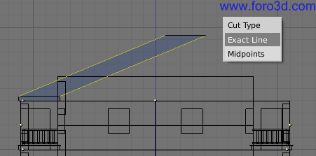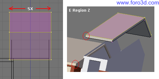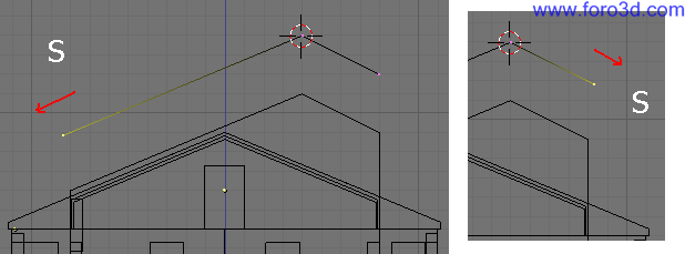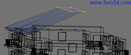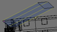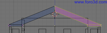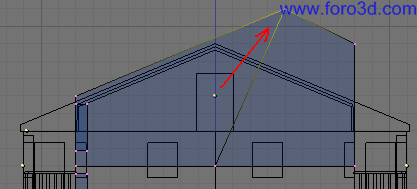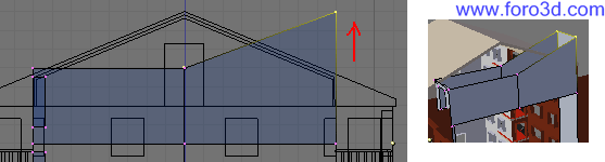 En vista lateral, lleva el objeto al sitio justo en el tejado central, cerca de lo más alto, y gíralo hasta darle una inclinación parecida. Después selecciona las líneas del exterior del objeto y las extruyes hacia abajo (e, z) hasta que se claven en el tejado.