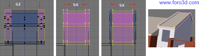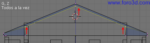Seleccionando solos vértices interiores, pulsando,x se puede hacer un poco más estrecha. Luego pulsando g, z se puede mover un poco hacia arriba, para que se quede más pegada al techo.