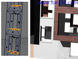 La última pared importante que nos queda es la de planta baja. Aquí, a la izquierda de la zona de las escaleras tendremos que modelar el portal de entrada a los pisos, y en todo lo demás colocaremos escaparates y puertas de las tiendas que van en esta planta. El tamaño y situación de estas puertas y ventanas no tiene por qué tener ninguna relación con las ventanas de los pisos.