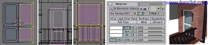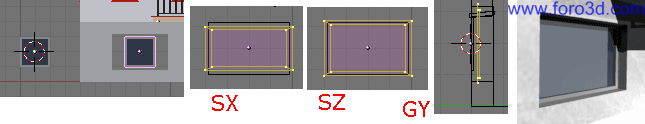 Para hacerla, duplica la ventana anterior con mayúsculas+d y llévala a su lugar en la pared. Ajusta las dimensiones del marco. Coloca el cursor en el centro del cristal fijo inferior seleccionándolo y pulsando mayúsculas+s, cursor>selection. Selecciona el material 2 (*.mat) 1 aluminio blanco para que los nuevos polígonos sean de ese material, inserta un plano, lo redimensionas para que tenga las dimensiones adecuadas. Muy importante, retíralo un poco del cristal (g, y) para que no queden polígonos superpuestos.