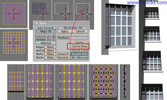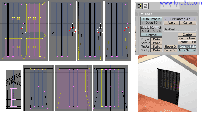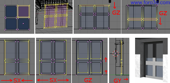 En la malla que va a servir como marco, elimina los vértices duplicados, llévala al hueco de una ventana para determinar sus dimensiones, y ajusta el tamaño del cristal inferior que sea muy pequeño. Los Marcos serán bastante estrechos, y el palo central horizontal también. Tendrás que mover los planos de los cristales más hacia dentro, y eliminar el cristal superior que no va a existir (x, only Faces).