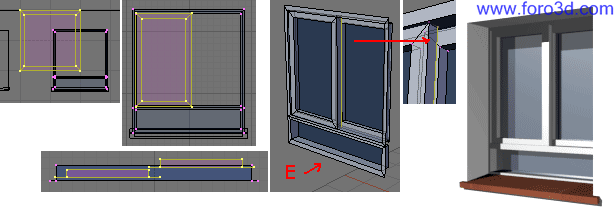 A continuación vamos a hacer que el hueco de la ventana tenga las paredes laterales, ya que el marco con los cristales no va a nivel de la pared, sino más adentro. Para conseguirlo, nos vamos a vista superior (7) y teniendo solo vértices interiores seleccionados hacemos una extrusión normal en dirección al eje Y. Habrá que pulsar eh, only Edges, y.