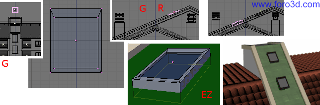 Vamos a aprovechar la ventana que dibujamos al principio para modelar las claraboyas que van en el tejado central. Mueve este objeto hasta lo alto del tejado. Modifica el tamaño del objeto para que sea un poco más pequeño (s) y un poco más estrecho (SX). También habrá que modificar el modelado para que el marco superior sea un poco más ancho que los otros.