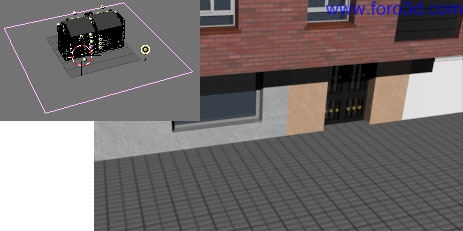 Colocaremos estos objetos en dos hileras a lo largo de la calle. Lo podemos hacer cómodamente en vista superior sabiendo que cada patrón del dibujo geométrico del suelo ocupa catorce unidades de la cuadrícula.