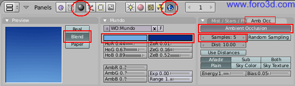 Para activar la oclusión ambiental pulsa el botón de sombreado de la barra de herramientas, el que tiene la bola gris, y en los de la derecha, el que tiene pintado un planeta, llamado botones de mundo. Hay una paleta de botones con una pestaña que pone AMB OCC. Allí solo hay un botón azul alargado que pone Ambient Occlusion. Púlsalo para activar la oclusión ambiental y verás que abajo aparecen muchos otros botones. Por ahora solo nos interesa el cuadro que pone samples: 5. A mayor número de simples mayor calidad y mayor tiempo de render. Un valor de 5 dará un resultado aceptable, pero con bastante ruido (puntitos) en la imagen. Si estas dispuesto a esperar más tiempo a que se haga el render, aumenta este valor.