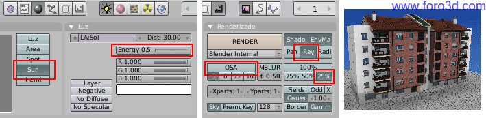 Más adelante construiremos la escena completa, pero ahora vamos a hacer un render bien hecho del bloque de pisos donde podremos ver posibles errores. Para obtener un render de mayor calidad vamos a usar la oclusión ambiental (AO). Esto consiste en que los objetos recibirán luz del cielo, además de recibirla de las luces. De esta forma se obtiene un resultado muy bueno en exteriores y no es imprescindible usar luces de relleno, será suficiente con poner el sol.