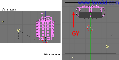 Antes de duplicar, puedes ir a vista superior (7) y mover el edificio hacia arriba (g. Y) para que el origen de coordenadas del espacio 3d (donde se cruzan los ejes de colores) se quede en el centro de la calle. Esto nos facilitara posteriormente el trabajo con las texturas de los suelos y los giros.