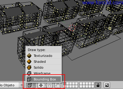 Si después de haber duplicado los bloques de pisos el programa se pone muy lento, puedes usar el modo de representación llamado bounding box pulsa el botón de la barra de herramientas de la ventana 3d y selecciónalo en el menú. Es el modo de dibujo de peor calidad que tiene Blender, ya que representa los objetos mediante cajas rectangulares para poder dibujar la pantalla más rápidamente. Puede ser útil cuando tengamos que mover la vista o la cámara.