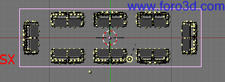 Ahora vamos a duplicar los edificios para construir la calle. Por supuesto lo haremos con alternativa+d para hacer copias enlazadas. En vista frontal o lateral selecciona todo el bloque de pisos con un rectángulo (mayúsculas+b). No selecciones ni el suelo, ni la cámara ni el sol.