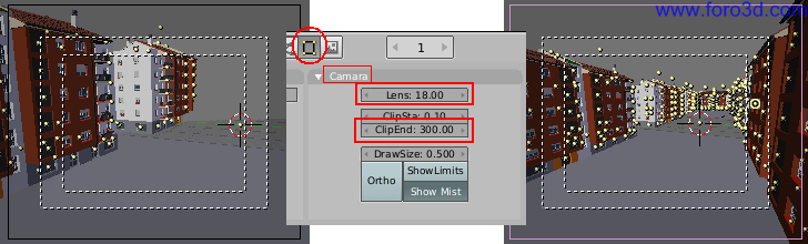 Para que la cámara fotografíe los objetos más lejanos tendremos que aumentar su campo de visión. Con la cámara seleccionada entra en los botones edición (f9) de la barra de herramientas y verás una paleta de botones llamada cámara. Allí aumenta el valor del cuadro Clipend a 300. Todo lo que quede más lejos de la cámara de 300 unidades de cuadrícula en línea recta no aparecerá en el render, ya sean objetos enteros o trozos.