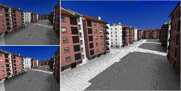 Según como situemos la cámara ocurrirá que alguno de los edificios no se vea, pero es importante que esté ahí porque afecta a la iluminación, a las sombras y a los reflejos en los cristales de las ventanas.