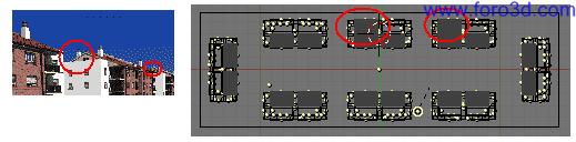 En el nuevo archivo que acabamos de crear tenemos el bloque de pisos completo, el plano del suelo, la cámara y el sol. Al duplicar siete veces más el bloque de pisos va a aumentar mucho el número de vértices y puede ocurrir que el funcionamiento del programa llegue a ser muy lento. Vamos a eliminar los objetos que con total seguridad no van a salir en los renders ni afectaran a las sobras o reflejos, especialmente los que tienen muchos vértices. Eliminaremos ahora los balcones y los tejados de la parte posterior. Si después hace falta alguno lo podremos recuperar fácilmente. No elimines ninguna chimenea.