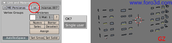 Selecciona el objeto de las persianas del edificio del fondo. En los botones de edición (f9), en la paleta de enlaces and materiales, entre los nombres del objeto (me: persianas y ob:persianas.007) hay un botón con un número. Este número es el número de copias que hay de ese objeto, pero esto ahora no nos interesa. Pulsa sobre el botón con el número y aparecerá un cuadro de confirmación ok? Make single user. Pulsa dentro y a partir de ahora este objeto será independiente de los otros de persianas. Puedes modificarlos sin que los cambios afecten a los otros. Los otros objetos seguirán estando enlazados entre sí. Pasa a modo de edición, selección de líneas y cambia la altura de algunas persianas.