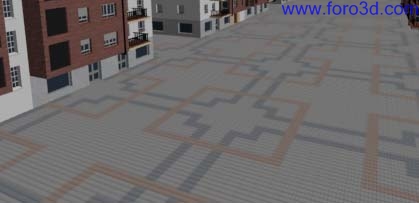 Los dibujos de la acera están correctamente alineados con el centro de la calle y con el segundo edificio, que está centrado frente al centro de coordenadas del espacio 3d, pero ya no coincide igual con los edificios primero y tercero ni esta centrado en las calles laterales. Sería conveniente ajustar esto para que se vea mejor y después poder colocar el mobiliario urbano coincidiendo al mismo tiempo con los dibujos del suelo y con la posición de los edificios. Esto lo haremos modificando los valores de tamaño (sizex, sizey y sizez). Por la cuenta de la vieja calculamos que el tamaño de la primera textura, la de relieve, tendrá que ser 2.86 en vez de 2 que es ahora (2 x (10 / 7) = 2.857.) y por lo tanto el tamaño de la segunda textura, la de los dibujos, textura tendrá que ser veinte veces menor, 0.143, (2.86 / 20). Modifica los valores en las casillas correspondientes a las dos texturas en su pestaña Map Imput correspondiente y arreglado. El tamaño de las losetas del suelo habrá disminuido un poco.