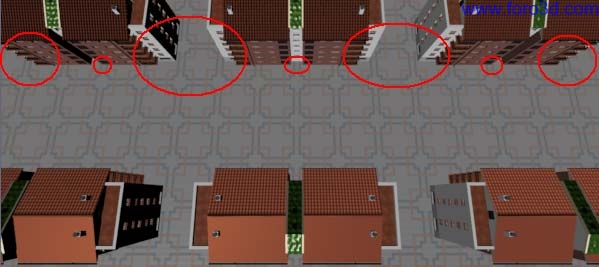 Viendo cómo va a ser el render definitivo, podemos ajustar algunas cosas para mejorar la imagen. En el segundo y tercer edificio de la izquierda se puede notar que falta el tejado trasero, o por lo menos el borde. Para volvérselo a poner es suficiente con duplicarlo desde otro edificio. Hay que tomar la teja que esta flotando en el aire y la malla que sirve para hacer el dupliverts. En este caso lo haremos simplemente con alternativa+d, pero si necesitáramos a toda cosa no aumentar demasiado el número de vértices, lo podríamos hacer con mayúsculas+d y después editar la malla para reducir el número de tejas y que solo se dibujen las del borde que son las que nos hacen falta.
